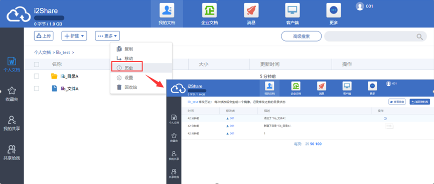 在资料库内,点击菜单栏中的“更多”按钮,在弹出菜单中选择“历史”进入资料库历史页面,可以进行查看该资料库内的操作历史。进入历史镜像后,可以进行查看历史镜像和还原镜像的操作。